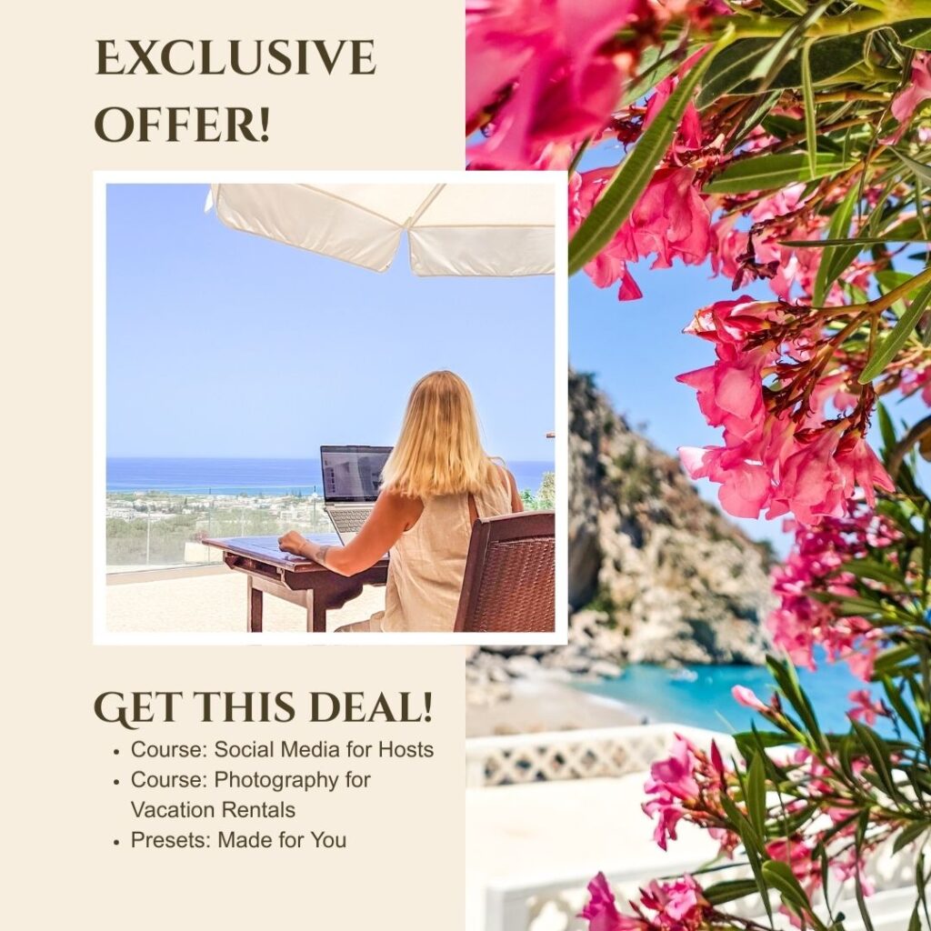 This bundle gives you the tools to grow your vacation rental with social media, better photos, and pro presets. Easy to follow, made for real hosts — no experience needed.